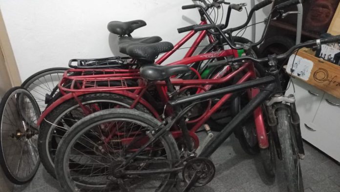 Aproximadamente 40 bicicletas estavam no local, sendo uma delas reconhecida como objeto de furto pela vítima que compareceu no local após solicitação do COPOM e reconheceu como sendo sua a bicicleta, bem como apresentou a nota fiscal do bem.