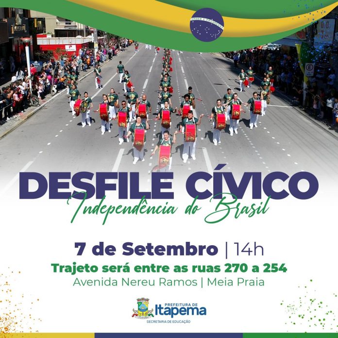 A Prefeitura de Itapema, por meio da Secretaria de Educação, realiza nesta quarta-feira (07/09), o tradicional Desfile Cívico em Comemoração a Independência do Brasil. O ato será na Avenida Nereu Ramos, no Bairro Meia Praia. O trajeto do desfile inicia na rua 270 em direção à rua 254, a partir das 14h.