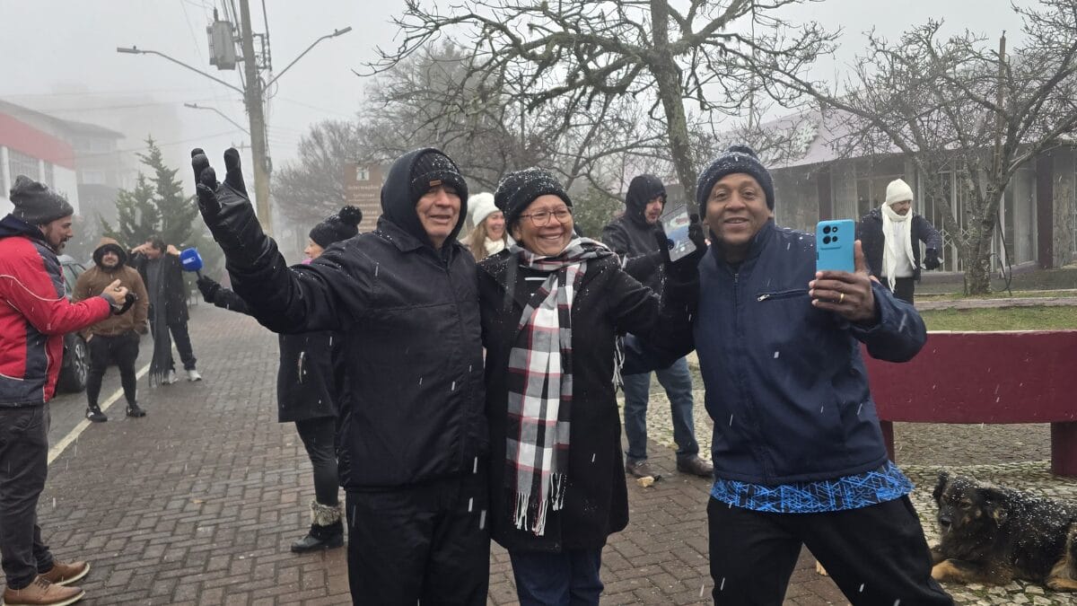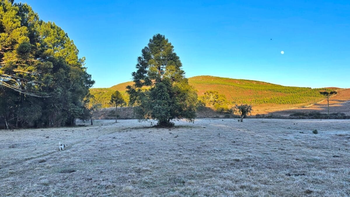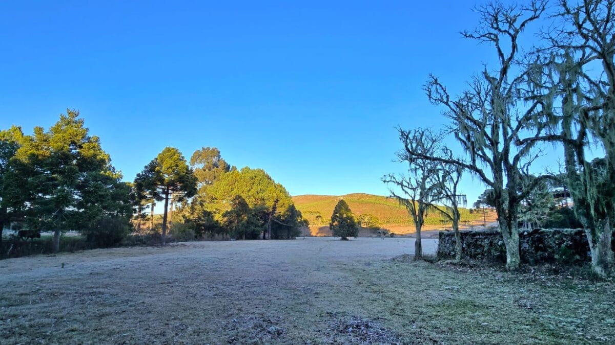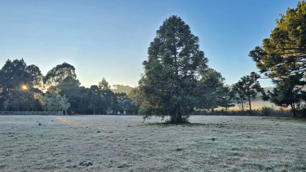 Imagens do local mostram a grama coberta por geada. O fenômeno acontece quando a temperatura do ar atinge ou fica abaixo de 0°C, permitindo que o vapor d’água presente no ar se condense e congele em superfícies como plantas e objetos.