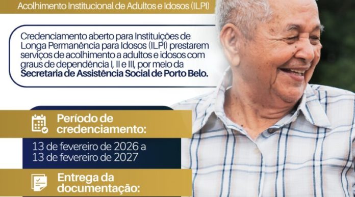O Governo de Porto Belo, por meio da Secretaria de Assistência Social, está com credenciamento aberto para Instituições de Longa Permanência para Idosos (ILPI) interessadas em prestar serviços de acolhimento institucional a adultos e idosos no município. O credenciamento tem como objetivo ampliar a rede de atendimento e garantir acolhimento adequado para pessoas com graus de dependência I, II e III, assegurando cuidado, proteção e qualidade de vida aos usuários que necessitam desse tipo de atendimento. As instituições interessadas devem apresentar a documentação necessária conforme estabelecido no edital. O período de credenciamento segue aberto de 13 de fevereiro de 2026 a 13 de fevereiro de 2027. A entrega da documentação deve ser realizada no Setor de Licitações , localizada na Rua José Guerreiro Filho, nº 265, Centro, em Porto Belo.