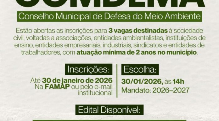 A Prefeitura de Porto Belo, por meio da Fundação Municipal de Meio Ambiente (FAMAP), publicou edital convocando entidades não governamentais para participarem do processo de escolha de novos representantes do Conselho Municipal de Defesa do Meio Ambiente (COMDEMA). A iniciativa busca complementar a composição do conselho, que ainda possui três assentos em aberto destinados à sociedade civil. As entidades interessadas devem protocolar o requerimento de inscrição, acompanhado da documentação exigida no edital, até o dia 30 de janeiro de 2026, junto à sede da FAMAP ou por meio de seu e-mail institucional. No mesmo dia, às 14h, será realizado o processo de escolha das três entidades que passarão a integrar o conselho.