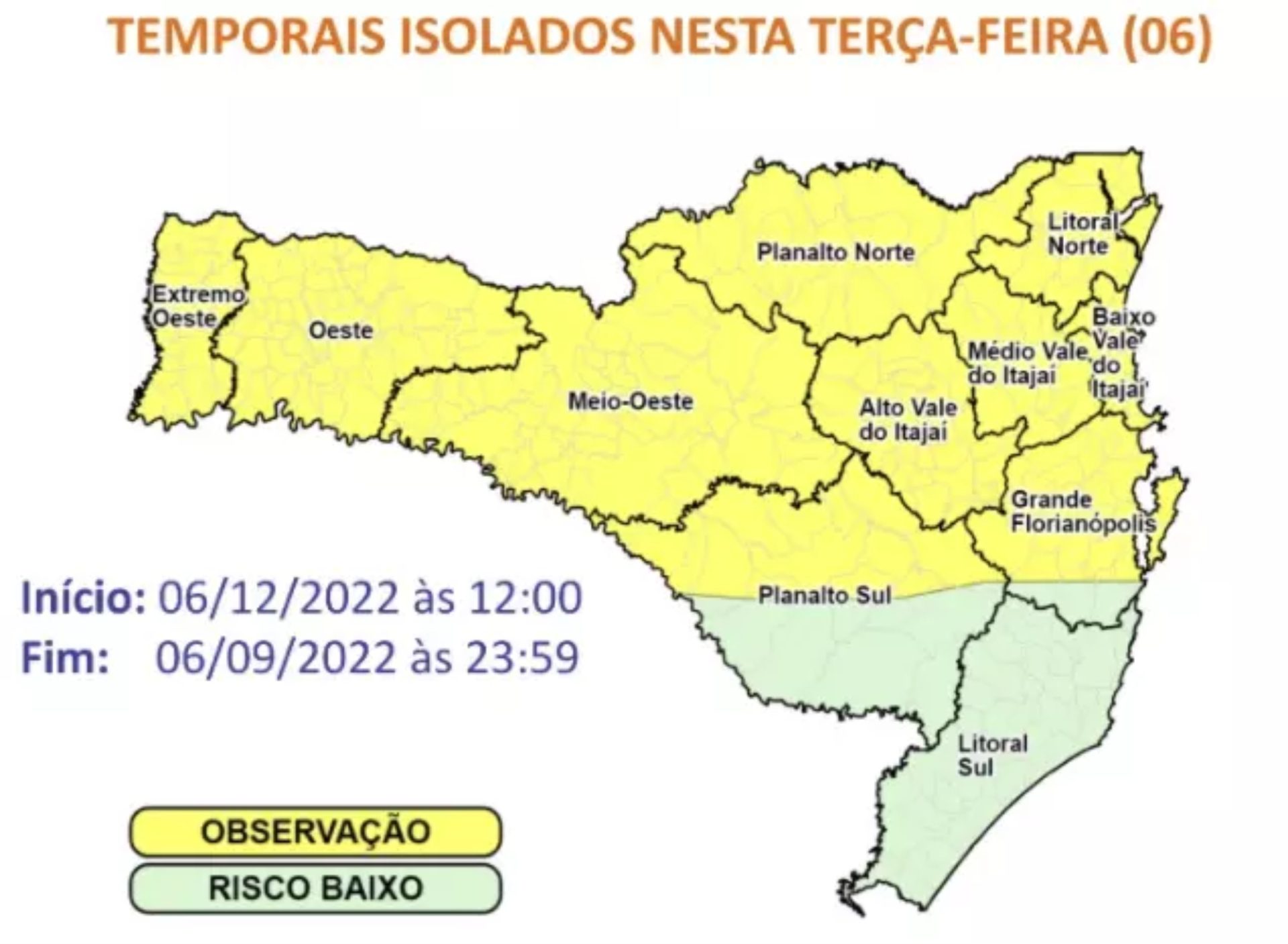 Esses temporais devem começar no começo da tarde e tendem a se intensificar entre o final da tarde e o início da noite, principalmente entre a Grande Florianópolis, Alto e Médio Vale do Itajaí, Meio Oeste e Planalto e Litoral Norte.